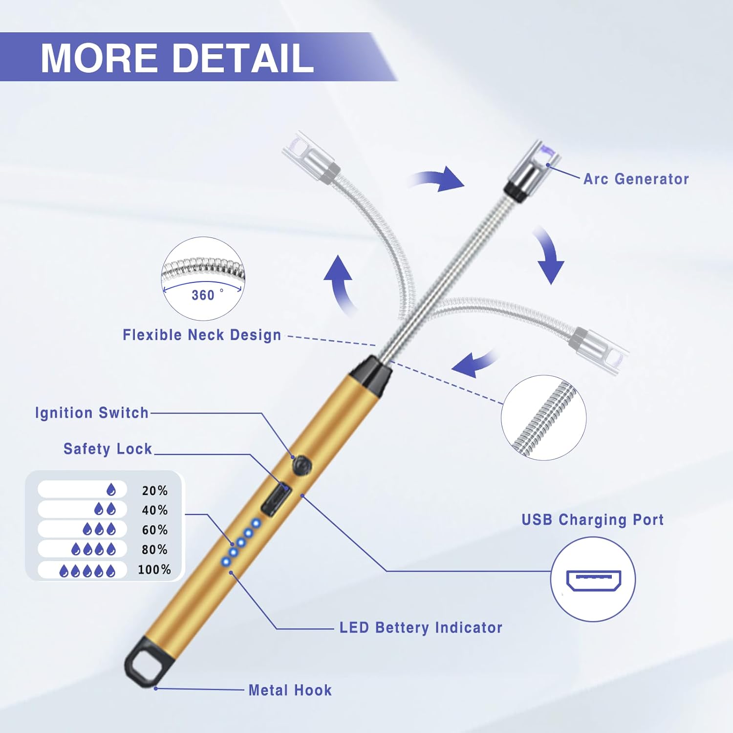 The candle lighter adopts plasma arc and flame-less technology, with no oil, gas, or flame design is safer than ordinary fuel lighters. It not only adds a safety switch lock that prevents children from accidentally touching it, but also sets the function of automatic power-off every 10 seconds, whic...