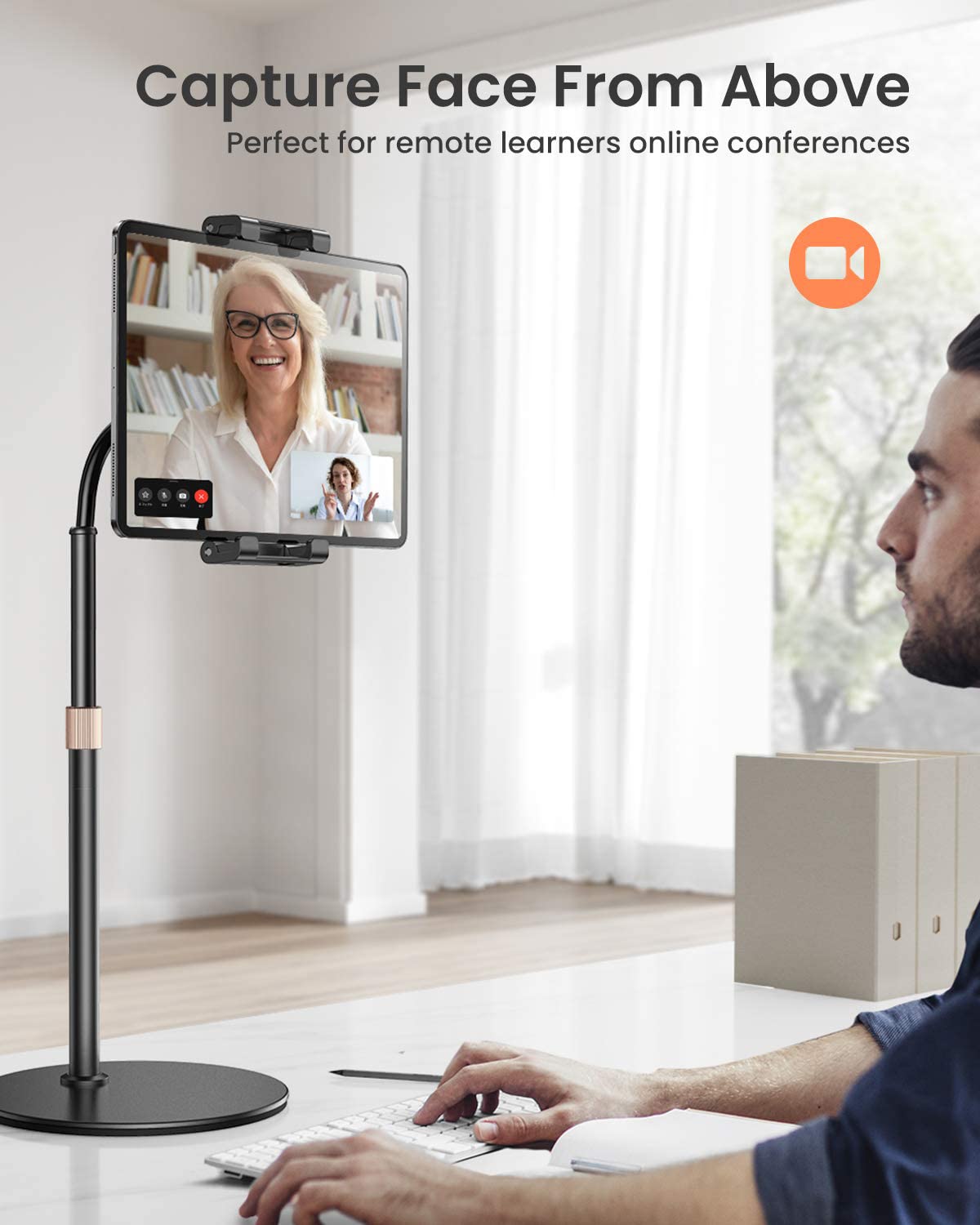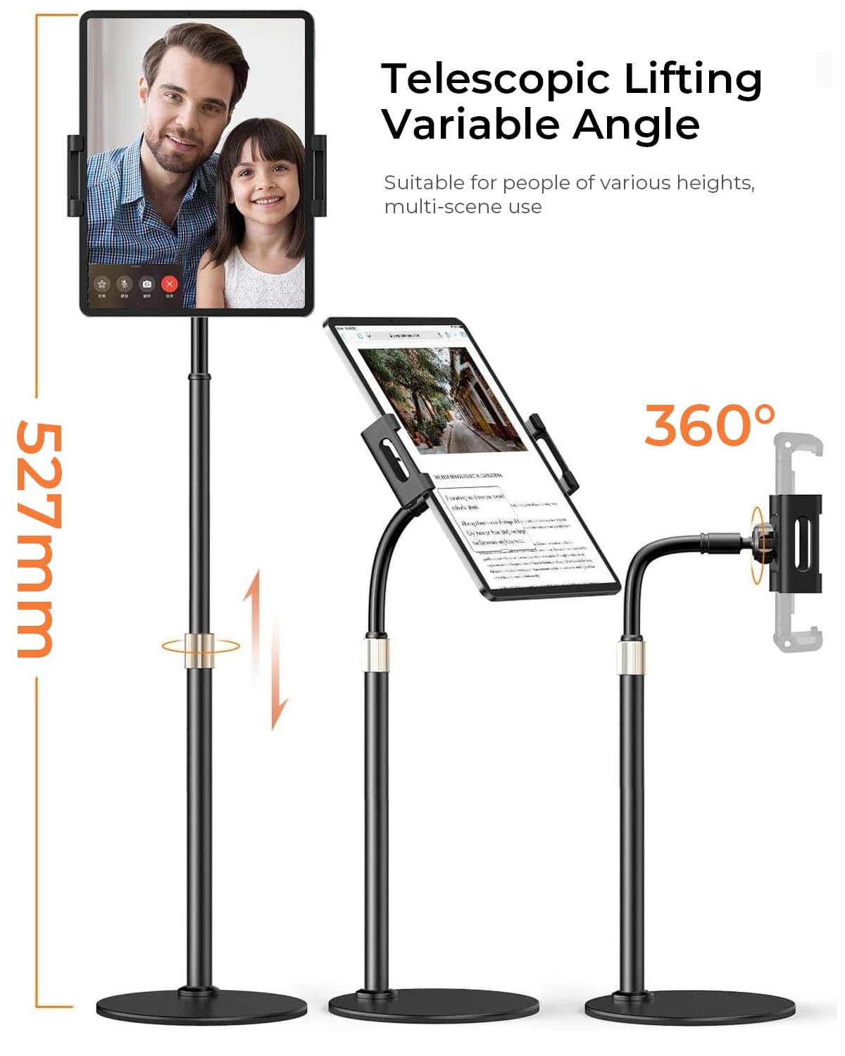 Tablet Stand Holder has been upgraded from three aspects, strengthen elastic silica gel clip, sturdy and thickened all-metal rod, upgraded round base and thickened EVA pad, which makes it super stable to support all Tablets. This iPad stand holder is height adjustable from 285mm to 447mm, angle 360 ...